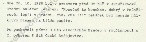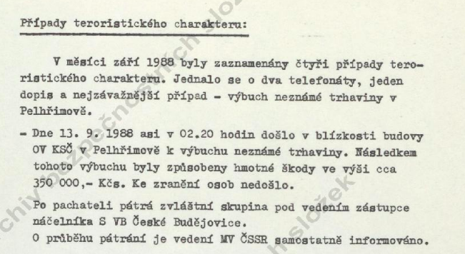 13.9. výbuch - 20. výročí přijetí zákona, který dovoloval činnost pouze stranám a organizacím Národní fronty (128/1968 Sb.) a zákona, který dovoloval národním výborům zakázat nebo zrušit veřejné shromáždění, které by mohlo narušit zahraničně politické zájmy státu, nebo by bylo zaměřeno proti socialistickému řádu (126/1968 Sb.)